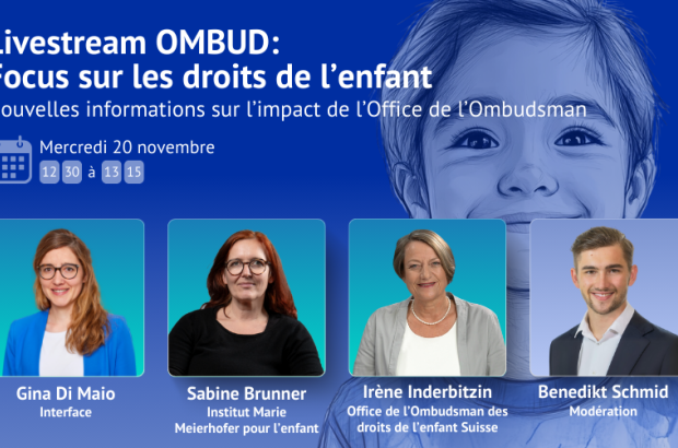 En studio, Gina Di Maio, autrice de l’analyse d’impact et cheffe de projet senior chez INTERFACE Politikstudien, Sabine Brunner, psychothérapeute et collaboratrice scientifique à l’Institut Marie Meierhofer pour l’enfant (MMI) et Irène Inderbitzin, directrice de l’Office de l’Ombudsman des droits de l’enfant Suisse, présenteront les résultats et s’entretiendront à leur sujet. Le livestream sera modéré par Benedikt Schmid.